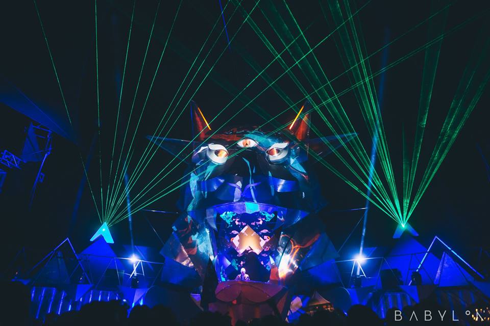 A 10-metre tall Jaguar spirit guide DJ booth created for Babylon Festival's second year. The structure features a mystical feline character serving as a gatekeeper to transcendence. Design creates an immersive experience through careful level curation connecting audiences to performers.